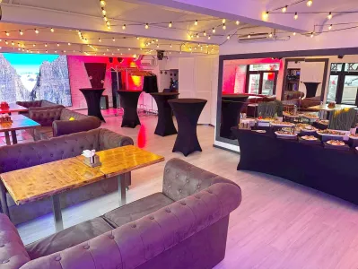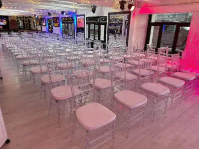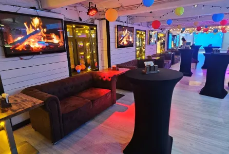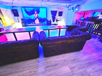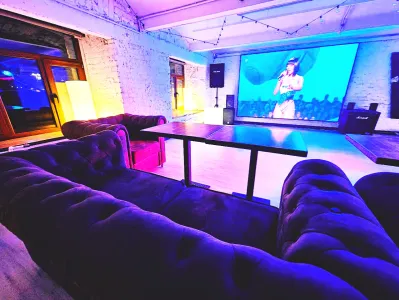 Например, для проведения корпоративной вечеринки иногда пространство почти полностью освобождается. Остается только танцпол, сцена, экран, караоке, и диваны с креслами и баром для организации фуршета с частичной рассадкой.