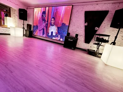 На фото видны танцпол, сцена, Led экран 3 на 2 метра и торжество на 20 человек.