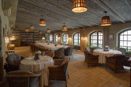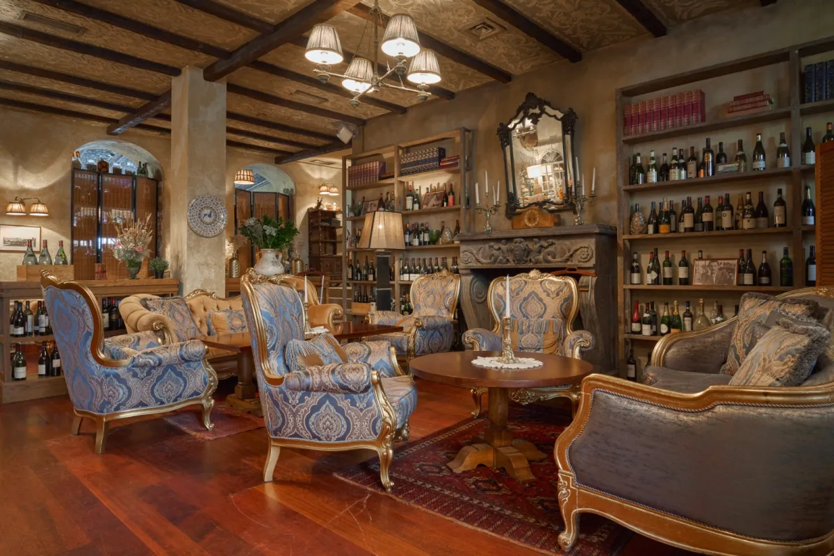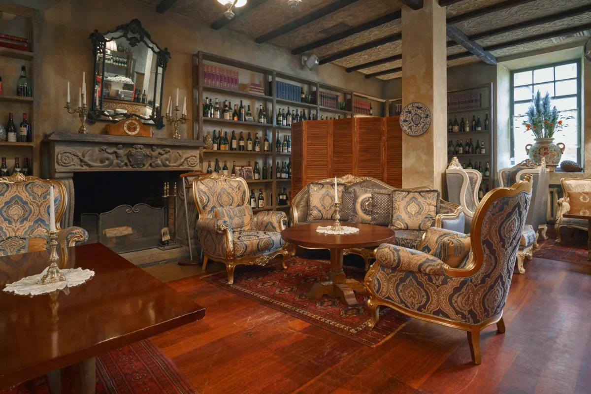 Первый этаж ресторана занимает камерный зал «Терраса». Пространство с ощущением уютной гостиной комфортно вмещает до 45 персон в формате банкета и до 60 гостей фуршетом. Старинные буфеты, живые цветы и мягкий свет на белых скатертях – здесь множество деталей располагают к неспешному ужину по важному поводу. Второй зал - «Энотека» с действующим камином и вычурными канделябрами, идеально подойдет для встречи небольшой компанией до 20 человек.