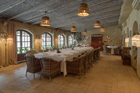 Второй этаж ресторана ведет гостей в просторный «Тосканский» зал. Пространство с высокими потолками, эффектными люстрами из муранского стекла, большими окнами, камином и сценой отлично подойдет для корпоративов, юбилеев и других семейных торжеств до 70 человек банкетом. Для мероприятий в узком кругу до 15 персон здесь предлагают уютную вип-комнату в венецианском стиле.
