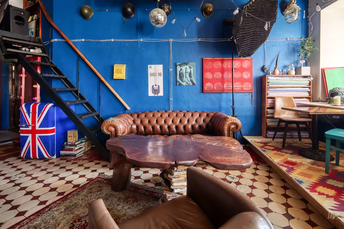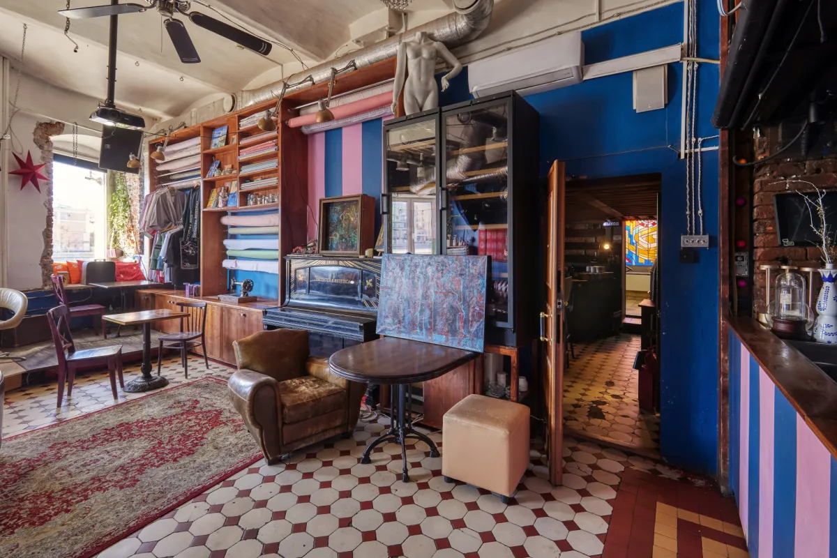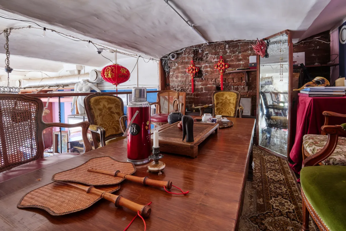 Пространство делится на две изолированные зоны: бар и ателье, где расположена чайная с антикварной мебелью и полным набором для церемонии. Ателье декорировано подлинными работами из галереи Эрнста Неизвестного, включая Нисского и Инфанте, каждая деталь создаёт ощущение культурной ценности и эстетической гармонии. Оба зала оснащены всем необходимым для мероприятий: звук, проектор, техника, пространство для активности, что позволяет вести параллельные активности, деловые встречи или камерные дегустации.