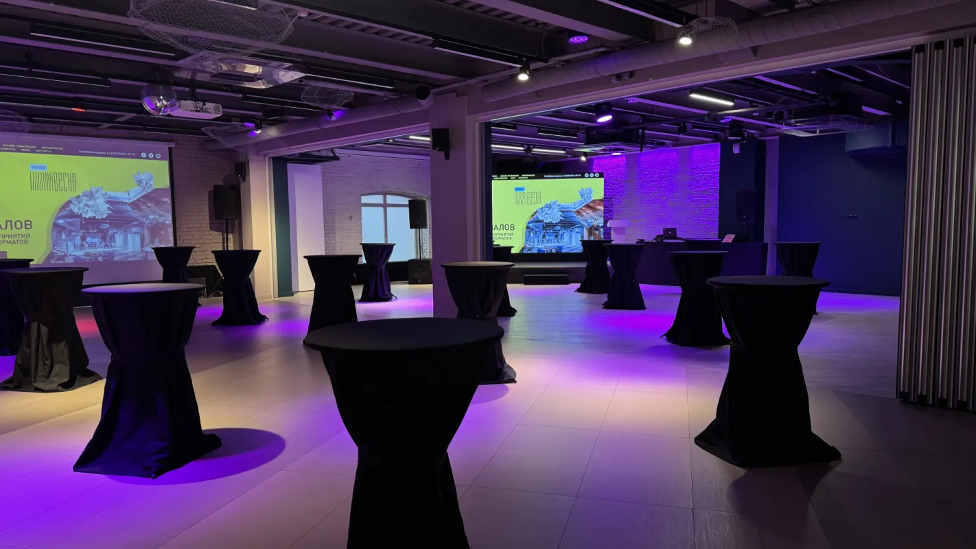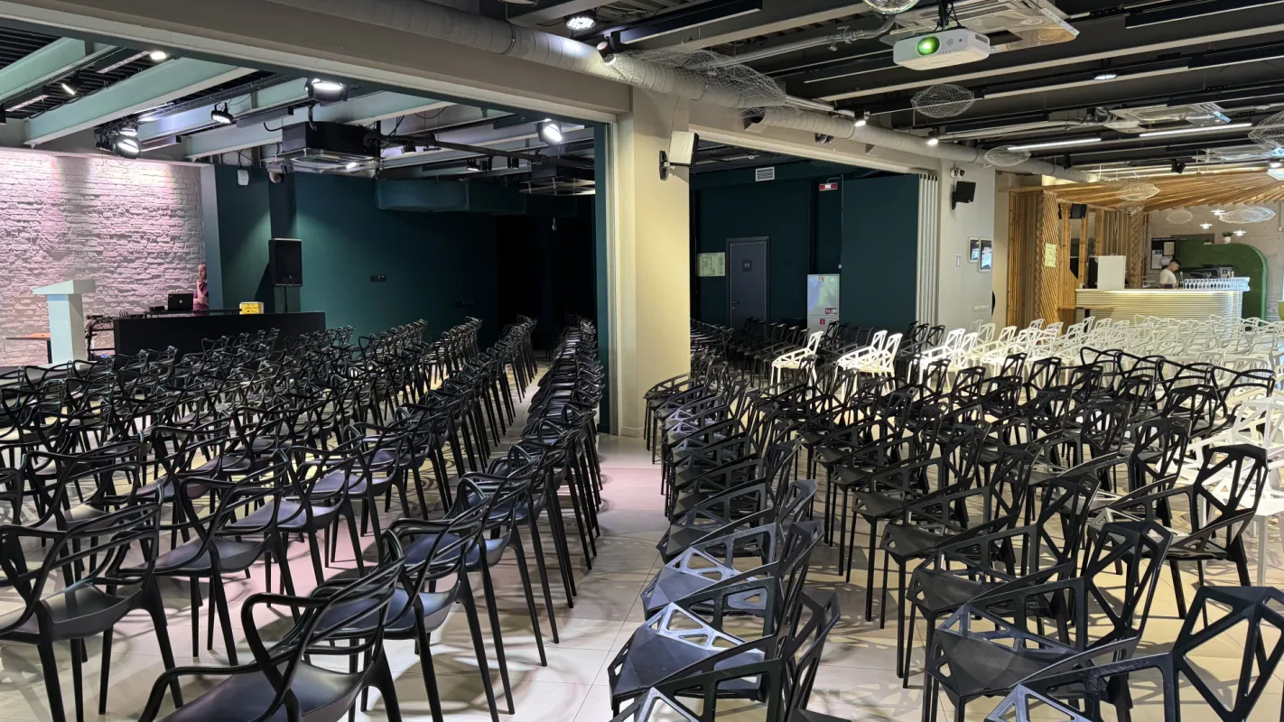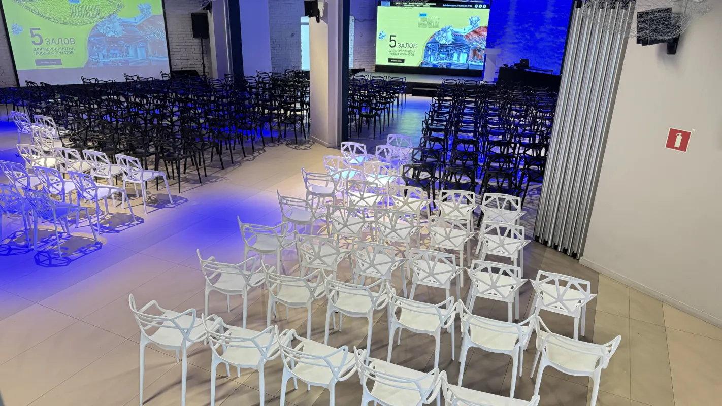 Второй этаж: Красный зал (140 кв.м)+Желтый зал (60 кв.м.) залы смежные. В стоимость аренды входит все необходимое оборудование, мебель и персонал: Светодиодный экран, колонки, микшерный пульт, микрофоны, столы, стулья, клининг до/во время/после мероприятия