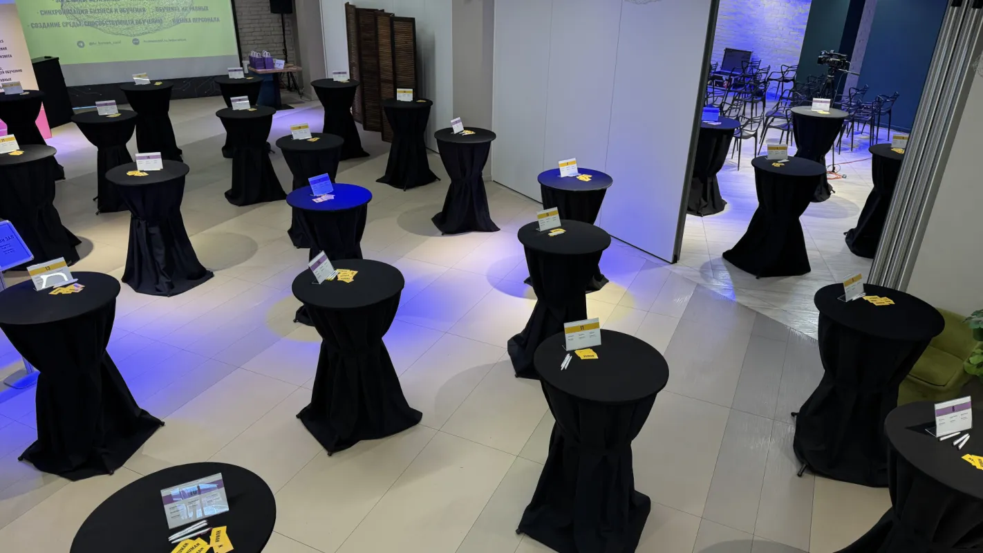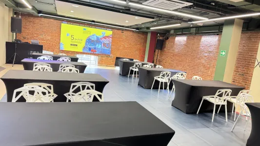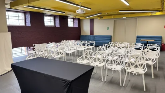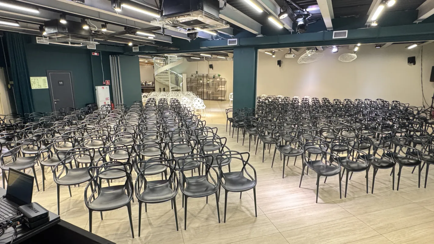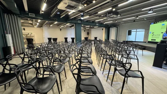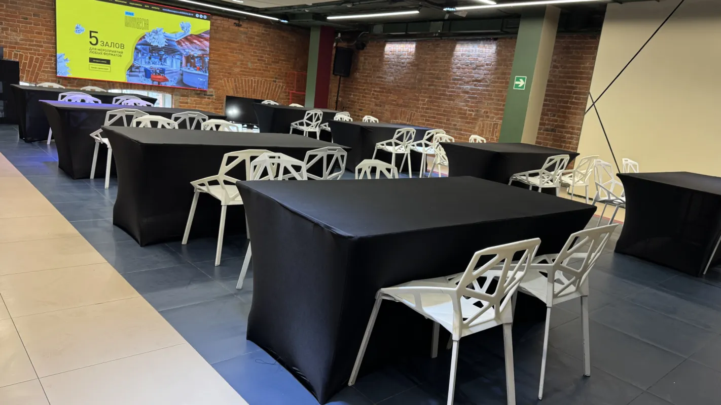 Второй этаж: Красный зал (140 кв.м)+Желтый зал (60 кв.м.) залы смежные. В стоимость аренды входит все необходимое оборудование, мебель и персонал: Светодиодный экран, колонки, микшерный пульт, микрофоны, столы, стулья, клининг до/во время/после мероприятия