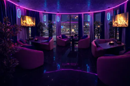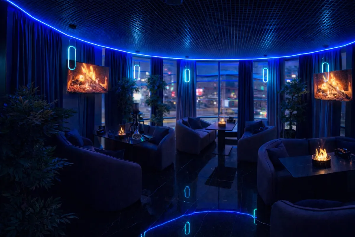 - Современный дизайн: Интерьер оформлен в стильных темных тонах с яркими неоновыми акцентами, создающими атмосферу уюта и современности.